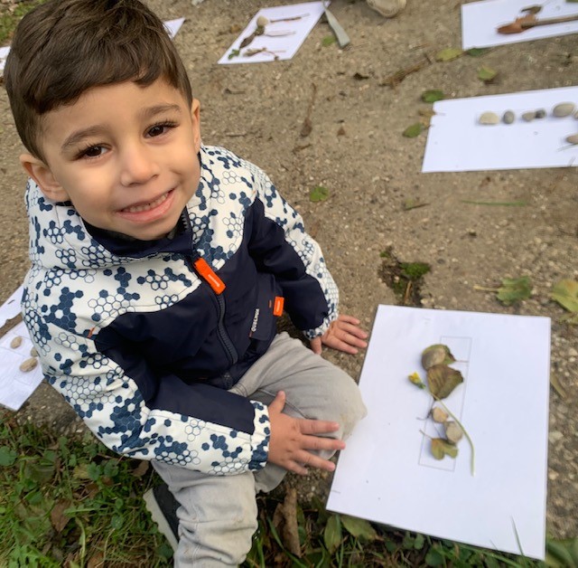 Les PS ont travaillé la reconnaissance de l’initiale de leur prénom. Ils devaient la recouvrir avec différents objets de la nature. Voici le résultat :